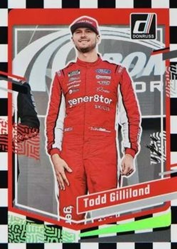 Todd Gilliland's Racing cards are available in at least 31 sets. Todd Gilliland's biggest 7-day price movers are 2024 Donruss NASCAR #12 Checkered Flag /1, 2024 Donruss NASCAR #12 Optic Gold Velocity /10, and 2024 Donruss NASCAR #23 Badge of Honor.
