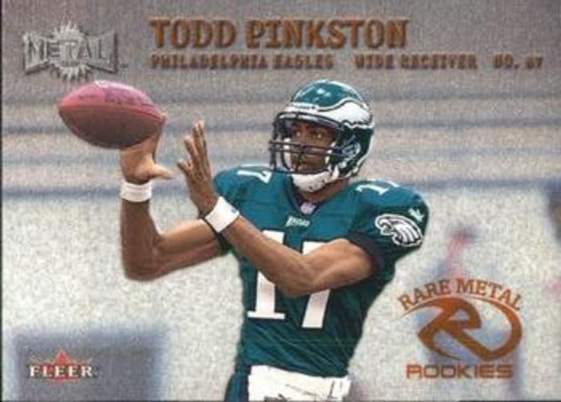 Todd Pinkston's Football cards are available in at least 8 sets. Todd Pinkston's biggest 7-day price movers are 2000 SPx #156 Spectrum /25, 2000 SPx #156 Base /1350, and 2000 Metal #296 Base.