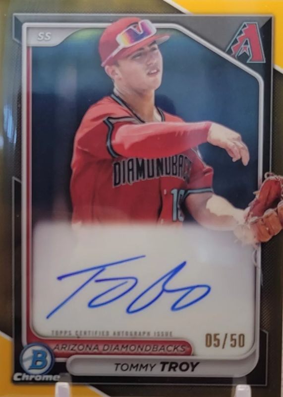 Tommy Troy's Baseball cards are available in at least 21 sets. Tommy Troy's biggest 7-day price movers are 2023 Bowman Draft #BDC-103 Chrome (1st), 2023 Bowman Draft #CDA-TT Chrome DP Auto (1st), and 2024 Bowman #CPA-TT Chrome Prospect Auto - Gold Refractor /50.