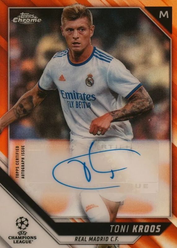 Toni Kroos' Soccer cards are available in at least 57 sets. Toni Kroos' biggest 7-day price movers are 2021 Topps Chrome UEFA Champions League #CA-TK Autographs - Orange Refractor /25, 2024 Topps Deco UEFA Club Competitions Legends - Gold /1, and 2024 Topps Deco UEFA Club Competitions Legends - Green /99.