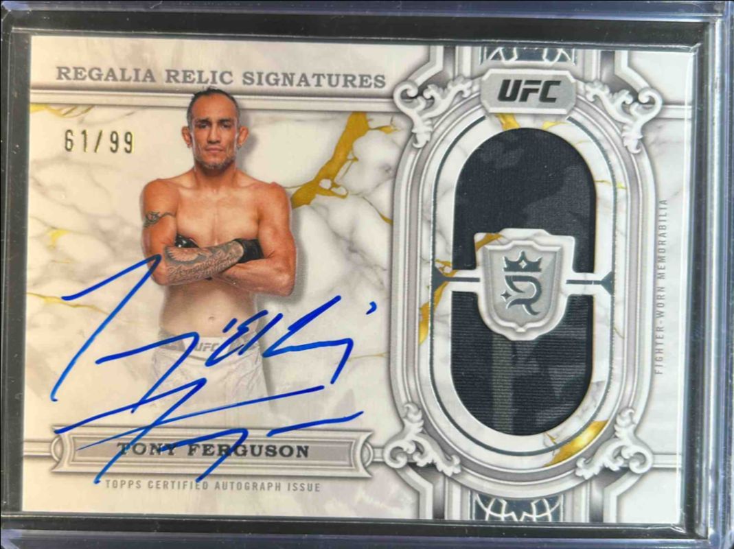 Tony Ferguson's MMA cards are available in at least 14 sets. Tony Ferguson's biggest 7-day price movers are 2024 Topps UFC Royalty #RRS-TFN Regalia Relic Signatures /99, 2024 Topps UFC Royalty #RCJ-17 Relic Jewels /99, and 2024 Topps UFC Royalty #9 Green /5.