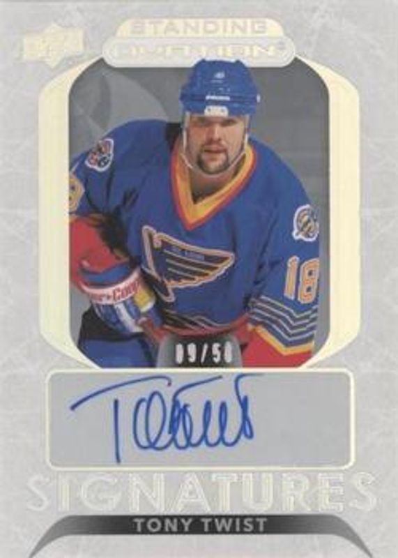 Tony Twist's Hockey cards are available in at least 41 sets. Tony Twist's biggest 7-day price movers are 2021 Upper Deck Ovation #SOS-TW Standing Ovation Signatures, 2023 Upper Deck Clear Cut #CC-TT 2021 Update - Autographs - High Gloss /10, and 2023 Upper Deck Clear Cut #CC-TT 2021 Update - Autographs - One-of-One /1.