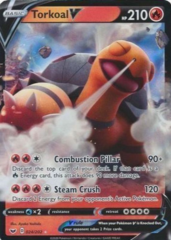 Torkoal V's Pokemon cards are available in at least 1 sets. Torkoal V's biggest 7-day price movers are 2020 Sword & Shield #188/202 Holo (Full Art), and 2020 Sword & Shield #024/202 Holo.