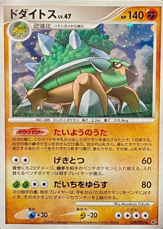 Torterra's Pokemon cards are available in at least 11 sets. Torterra's biggest 7-day price movers are 2008 Japanese Diamond & Pearl: Intense Fight in the Destroyed Sky #059/092 Unlimited Holo, 2007 Diamond & Pearl #017/130 Holo, and 2008 Japanese Diamond & Pearl: Intense Fight in the Destroyed Sky #059/092 1st Edition Holo.