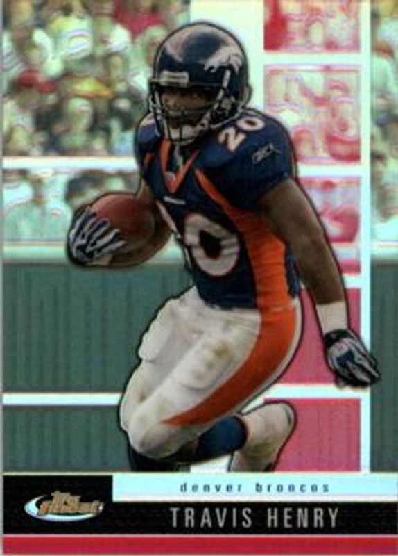 Travis Henry's Football cards are available in at least 53 sets. Travis Henry's biggest 7-day price movers are 2008 Topps Finest #50 Red Refractor /25, 2008 Topps Finest #50 Printing Plates Cyan /1, and 2008 Topps Finest #50 Printing Plates Black /1.