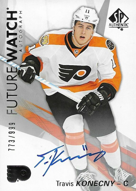 Travis Konecny's Hockey cards are available in at least 66 sets. Travis Konecny's biggest 7-day price movers are 2016 SP Authentic #154 Future Watch Auto /999, 2023 Upper Deck Artifacts #106 Leather, and 2023 Upper Deck Artifacts #106 Black /5.