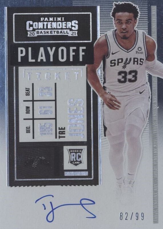 Tre Jones' Basketball cards are available in at least 27 sets. Tre Jones' biggest 7-day price movers are 2020 Contenders #120 Rookie Ticket Auto - Playoff Ticket /99 (White Jersey), 2020 Origins #RJA-JON Rookie Jersey Autographs - Gold /10, and 2020 Prizm #RS-TJN Rookie Signatures.