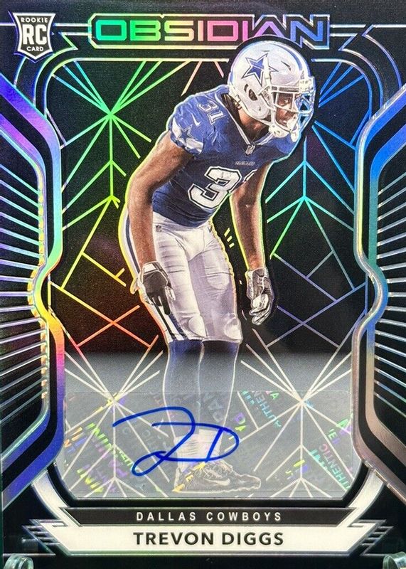Trevon Diggs' Football cards are available in at least 14 sets. Trevon Diggs' biggest 7-day price movers are 2020 Obsidian #146 Rookie Autographs (/150), 2020 Select #196 Premier Level Gold Disco /10, and 2020 Select #196 Premier Level FOTL Neon Orange Pulsar /7.