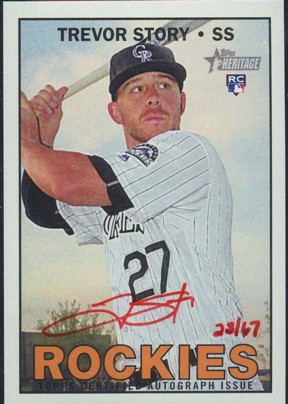 Trevor Story's Baseball cards are available in at least 95 sets. Trevor Story's biggest 7-day price movers are 2016 Topps Heritage High Number #ROA-TS Real One Autographs - Red Ink /67, 2011 Bowman Draft #BCAP-TS Chrome Prospect Auto - Refractor /500 (1st), and 2024 Topps Pristine #78 Red Refractor /5.