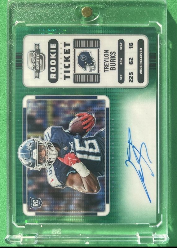 Treylon Burks' Football cards are available in at least 32 sets. Treylon Burks' biggest 7-day price movers are 2022 Contenders Optic #137 Rookie Ticket Auto, 2022 Onyx Vintage #VATR Blue Signatures Autographs, and 2022 Onyx Vintage #VFTR Base.