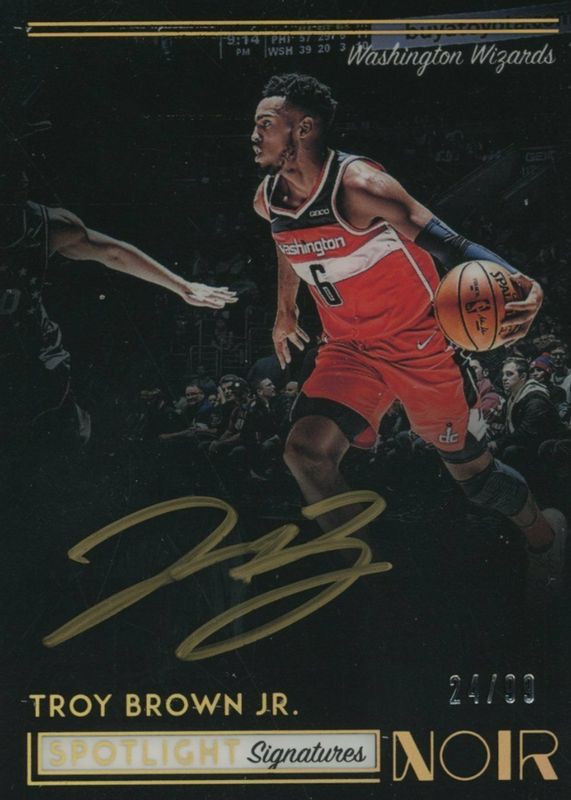 Troy Brown Jr.'s Basketball cards are available in at least 8 sets. Troy Brown Jr.'s biggest 7-day price movers are 2018 Noir Spotlight Signatures /99, 2018 Select #241 Courtside Black /1, and 2018 Donruss #192 Base.