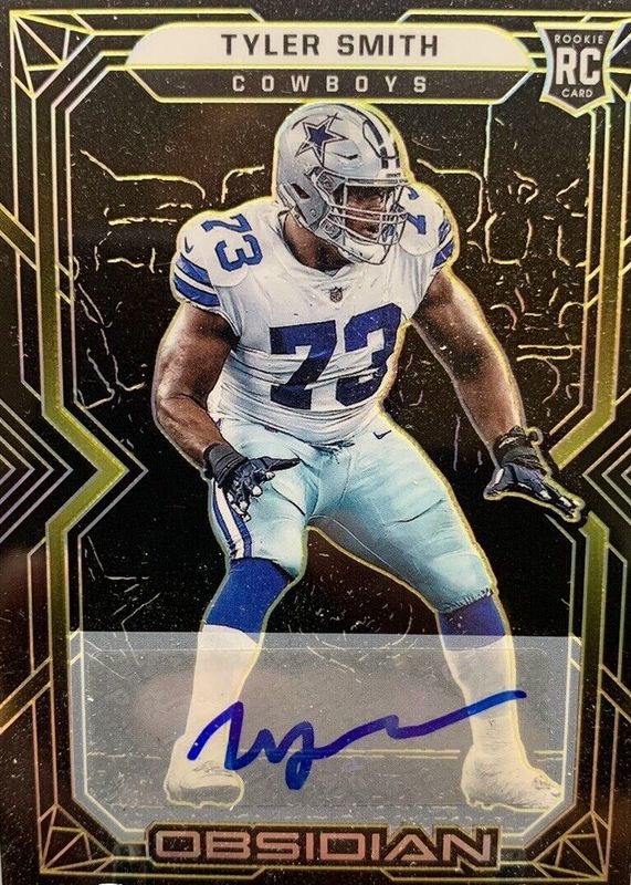 Tyler Smith's Football cards are available in at least 1 sets. Tyler Smith's biggest 7-day price movers are 2022 Obsidian #160 Rookie Autographs - Electric Etch Yellow /25, 2022 Obsidian #160 Rookie Autographs - Electric Etch Orange /75, and 2022 Obsidian #160 Rookie Autographs - Electric Etch Red /10.
