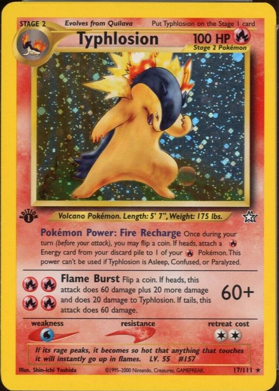 Typhlosion's Pokemon cards are available in at least 17 sets. Typhlosion's biggest 7-day price movers are 2006 Nintendo Black Star Promo #034 Value Pack II, 2015 XY: BREAKthrough #020/162 Holo, and 2000 Neo Genesis #17/111 1st Edition Holo.