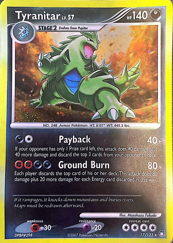 Tyranitar's Pokemon cards are available in at least 23 sets. Tyranitar's biggest 7-day price movers are 2007 Diamond & Pearl: Mysterious Treasures #017/123 Holo, 2003 Aquapolis #040/147 Reverse Holo, and 2002 Expedition #029/165 Holo.