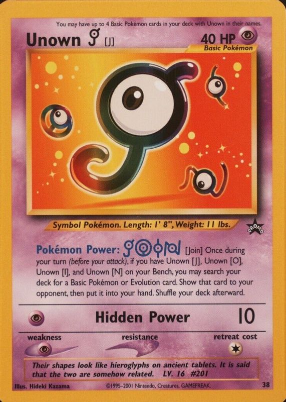Unown J's Pokemon cards are available in at least 2 sets. Unown J's biggest 7-day price movers are 2001 Wizards Black Star Promo #38 Base (Movie Promo), 2008 Diamond & Pearl: Legends Awakened #076/146 Base, and 2008 Diamond & Pearl: Legends Awakened #076/146 Reverse Holo.