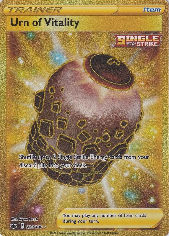 Urn of Vitality's Pokemon cards are available in at least 3 sets. Urn of Vitality's biggest 7-day price movers are 2021 Sword & Shield: Chilling Reign #229/198 Holo (Secret), 2021 Japanese Sword & Shield: VMAX Climax #134/184 Base, and 2021 Japanese Sword & Shield: VMAX Climax #134/184 Reverse Holo.