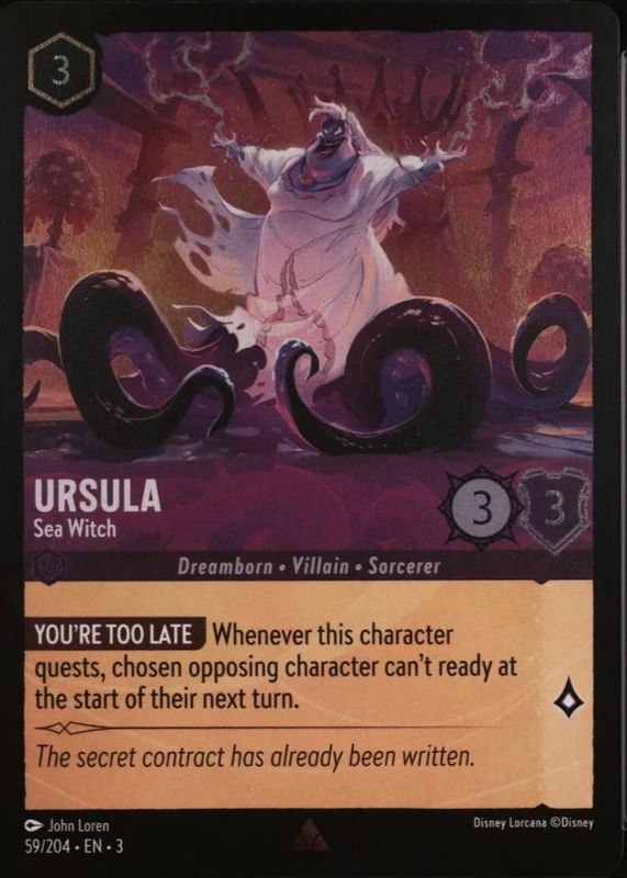 Ursula - Sea Witch's Disney Lorcana cards are available in at least 2 sets. Ursula - Sea Witch's biggest 7-day price movers are 2024 Into the Inklands #59/204 Cold Foil, 2024 Into the Inklands #59/204 Base, and 2025 Fabled #37/204 Base.