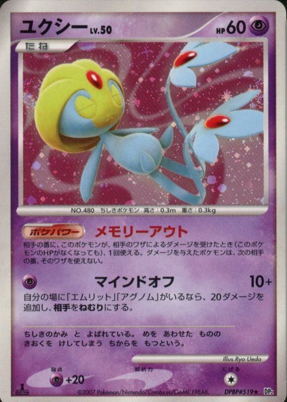 Uxie's Pokemon cards are available in at least 7 sets. Uxie's biggest 7-day price movers are 2007 Japanese Diamond & Pearl: Secret of the Lakes #519 1st Edition Holo, 2007 Diamond & Pearl: Mysterious Treasures #018/123 Holo, and 2024 Japanese Scarlet & Violet: Super Electric Breaker #048/106 Base.
