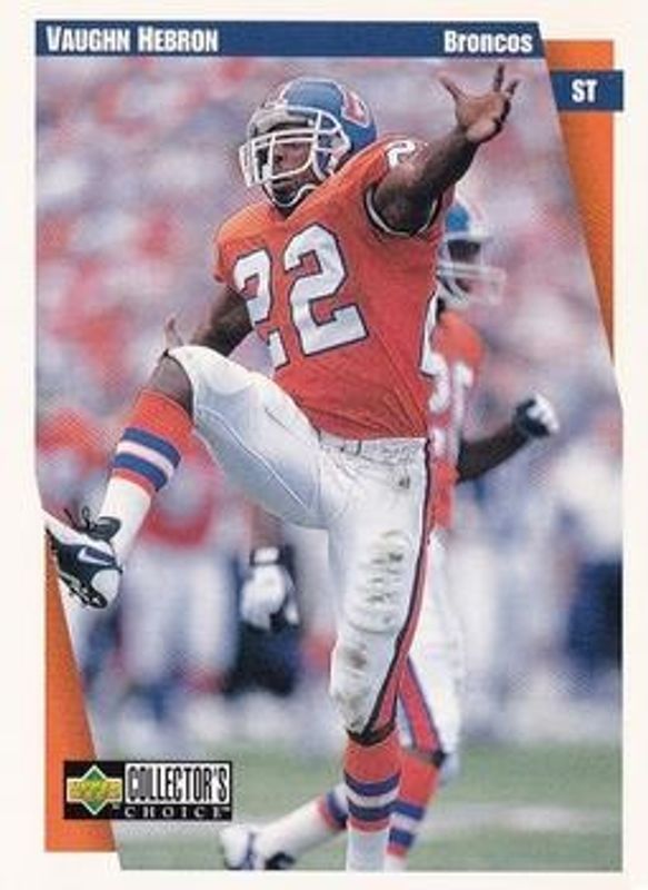 Vaughn Hebron's Football cards are available in at least 4 sets. Vaughn Hebron's biggest 7-day price movers are 1997 Upper Deck Collector's Choice #122 Base, 1995 Pacific Prisms #180 Gold, and 1995 Pacific Prisms #180 Base.