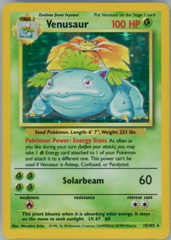 Venusaur's Pokemon cards are available in at least 23 sets. Venusaur's biggest 7-day price movers are 1999 Japanese CD Promo #3 Holo (CD Promo), 1999 Pokemon Game #15 Unlimited Holo, and 2000 Wizards Black Star Promo #13 TCG Game Guide.
