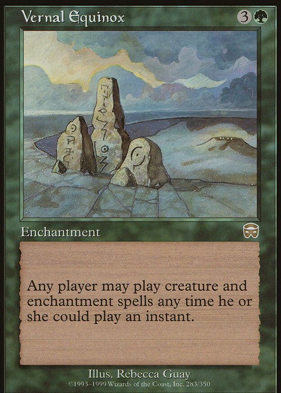 Vernal Equinox's Magic: The Gathering cards are available in at least 1 sets. Vernal Equinox's biggest 7-day price movers are 1999 Mercadian Masques #283 Foil.