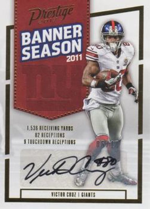 Victor Cruz's Football cards are available in at least 114 sets. Victor Cruz's biggest 7-day price movers are 2017 Prestige #24 Banner Season Ink /10, 2017 Prestige #47 Veteran Signatures - Xtra Points Bronze /10, and 2017 Prestige #47 Veteran Signatures /50.