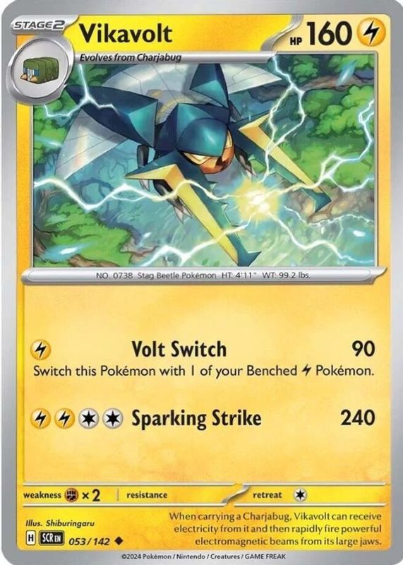 Vikavolt's Pokemon cards are available in at least 3 sets. Vikavolt's biggest 7-day price movers are 2026 Mega Evolution: Ascended Heroes #66/217 Quick Ball Reverse Holo, 2026 Mega Evolution: Ascended Heroes #230/217 Illustration Rare, and 2024 Scarlet & Violet: Stellar Crown #053/142 Base.