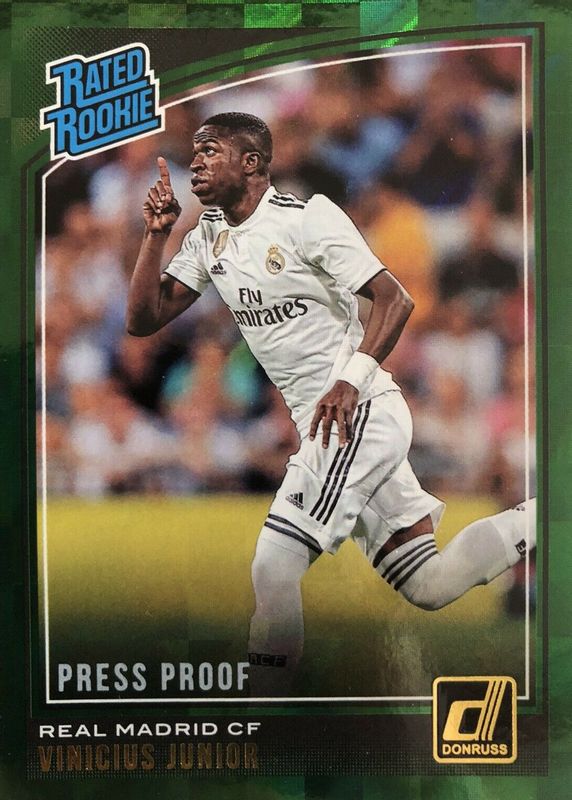 The biggest 30-day change Vinicius Jr. cards are 2018 Donruss #177 Press Proof Red, 2018 Donruss #177 Optic, and 2018 Donruss #177 Press Proof Green.