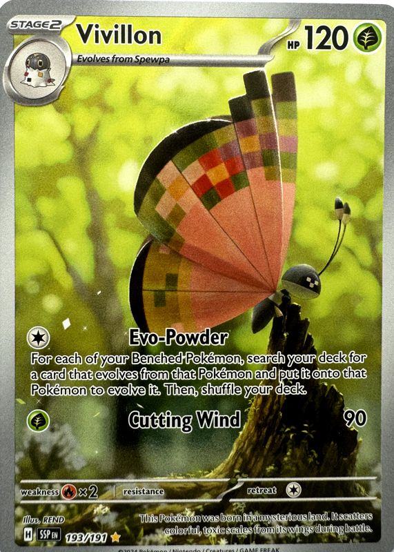 Vivillon's Pokemon cards are available in at least 4 sets. Vivillon's biggest 7-day price movers are 2024 Japanese Scarlet & Violet: Super Electric Breaker #107/106 Art Rare, 2015 Japanese XY: Blue Shock #008/059 1st Edition Holo, and 2024 Scarlet & Violet: Surging Sparks #007/191 Reverse Holo.