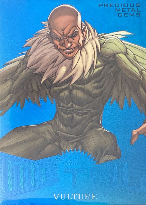 Vulture's Marvel cards are available in at least 14 sets. Vulture's biggest 7-day price movers are 2017 Fleer Ultra Spider-Man #MM42 Precious Metal Gems Blue /49, 2017 Fleer Ultra Spider-Man #EX9 EX Century, and 2017 Fleer Ultra Spider-Man #PA5 Preserved Amber City Scape /15.
