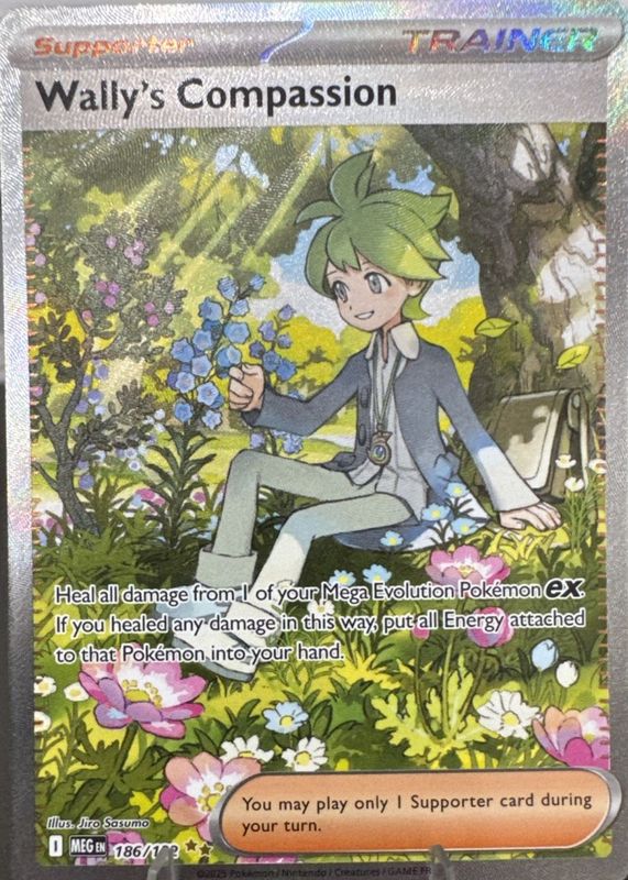 Wally's Compassion's Pokemon cards are available in at least 2 sets. Wally's Compassion's biggest 7-day price movers are 2025 Mega Evolution #186/132 Special Illustration Rare, 2025 Mega Evolution #132/132 Base, and 2025 Mega Evolution #176/132 Ultra Rare (Full Art).