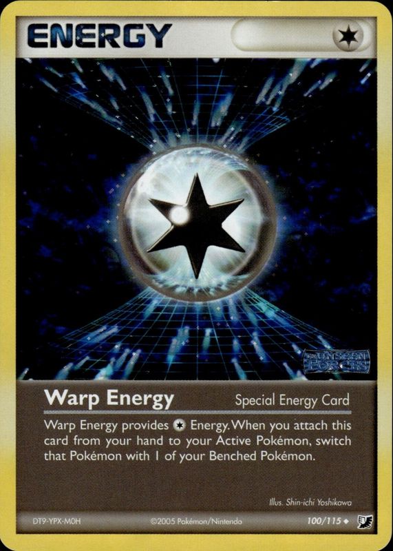 Warp Energy's Pokemon cards are available in at least 10 sets. Warp Energy's biggest 7-day price movers are 2017 Sun & Moon: Crimson Invasion #123/111 Holo (Secret), 2005 EX: Unseen Forces #100/115 Reverse Holo, and 2003 Aquapolis #147/147 Reverse Holo.