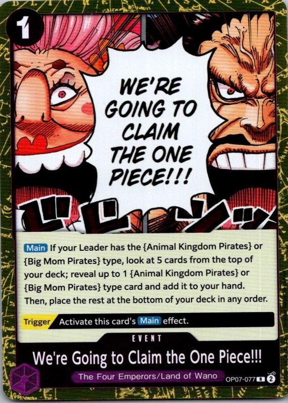 We're Going to Claim the One Piece!!!'s One Piece cards are available in at least 1 sets. We're Going to Claim the One Piece!!!'s biggest 7-day price movers are 2024 500 Years in the Future #OP07-077 Foil.