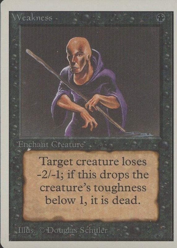 Weakness' Magic: The Gathering cards are available in at least 3 sets. Weakness' biggest 7-day price movers are 1993 Beta Edition Base, 1993 Unlimited Edition Base, and 1993 Alpha Edition Base.