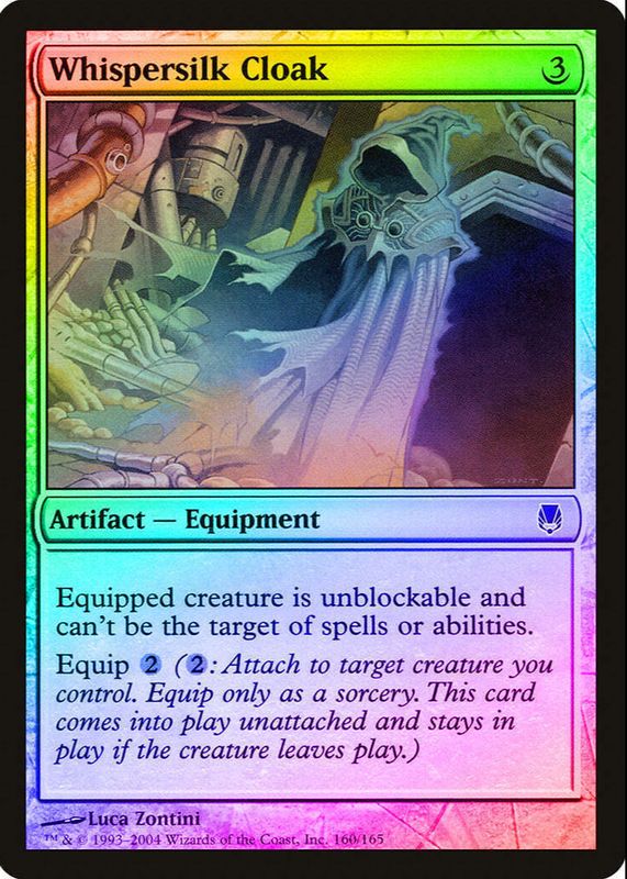 Whispersilk Cloak's Magic: The Gathering cards are available in at least 1 sets. Whispersilk Cloak's biggest 7-day price movers are 2004 Darksteel #160 Foil, and 2004 Darksteel #160 Base.
