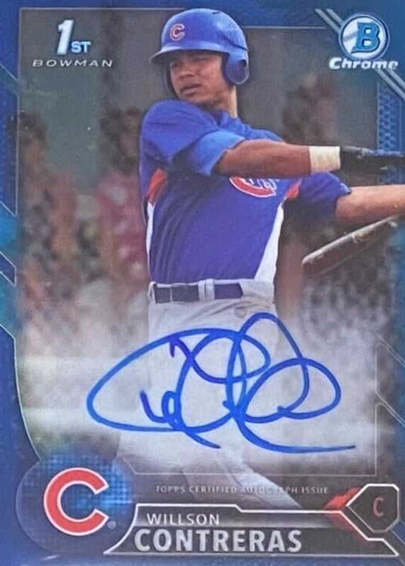 Willson Contreras' Baseball cards are available in at least 95 sets. Willson Contreras' biggest 7-day price movers are 2016 Bowman #CPA-WC Chrome Prospect Auto - Blue Refractor /150 (1st), 2016 Bowman #CPA-WC Chrome Prospect Auto - Purple Refractor /250 (1st), and 2022 Topps Dynasty #DAP-WC4 Base /10.