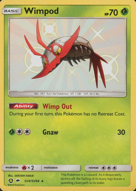 Wimpod's Pokemon cards are available in at least 8 sets. Wimpod's biggest 7-day price movers are 2019 Sun & Moon: Hidden Fates #SV4/SV94 Shiny Rare, 2017 Japanese Sun & Moon: Islands Await You #006/050 Base, and 2017 Japanese Sun & Moon: Darkness that Consumes Light #006/051 Base.