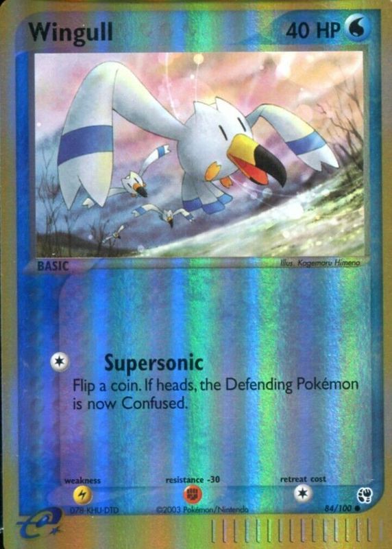 Wingull's Pokemon cards are available in at least 16 sets. Wingull's biggest 7-day price movers are 2003 EX: Sandstorm #084/100 Reverse Holo, 2018 Japanese Sun & Moon: Sky-Splitting Charisma #069/096 Base, and 2006 EX: Crystal Guardians #070/100 Reverse Holo.