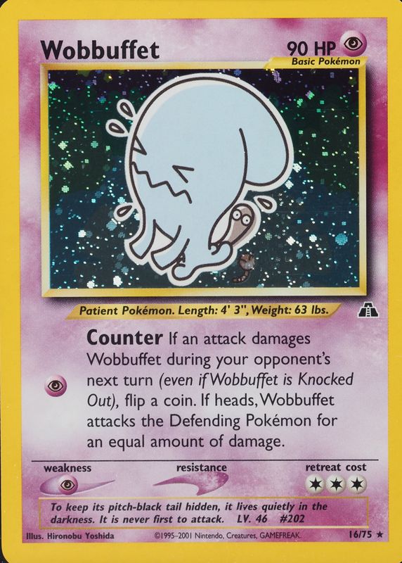 Wobbuffet's Pokemon cards are available in at least 22 sets. Wobbuffet's biggest 7-day price movers are 2000 Japanese Crossing the Ruins #202 Holo, 2007 EX: Power Keepers #024/108 Base, and 2001 Neo Discovery #16/75 Holo.