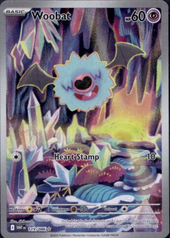 Woobat's Pokemon cards are available in at least 14 sets. Woobat's biggest 7-day price movers are 2025 Japanese Scarlet & Violet: White Flare #116/086 Art Rare, 2015 Japanese XY: Blue Shock #027/059 1st Edition, and 2019 Japanese Sun & Moon: Alter Genesis #029/095 Base.