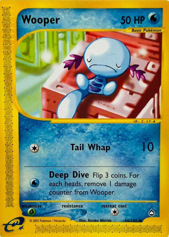 Wooper's Pokemon cards are available in at least 21 sets. Wooper's biggest 7-day price movers are 2000 Neo Genesis #82/111 1st Edition, 2000 Japanese Crossing the Ruins #194 Base, and 2000 Japanese Gold, Silver, to a New World #194 Base.