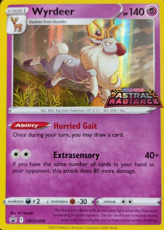 Wyrdeer's Pokemon cards are available in at least 2 sets. Wyrdeer's biggest 7-day price movers are 2022 Japanese Sword & Shield: Battle Region #070/067 Character Rare, and 2022 Sword & Shield: Black Star Promo #SWSH206 Build & Battle Box (Astral Radiance).