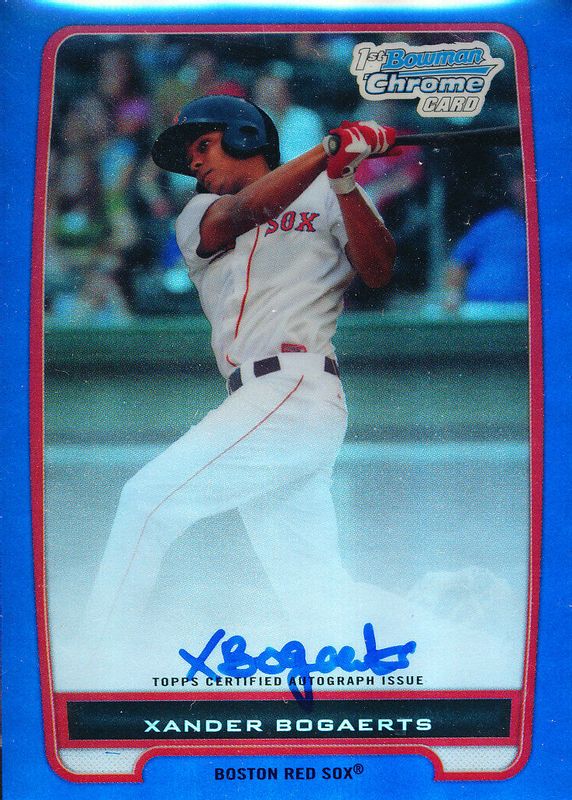 Xander Bogaerts' Baseball cards are available in at least 128 sets. Xander Bogaerts' biggest 7-day price movers are 2012 Bowman #BCP105 Chrome Prospect Auto - Blue Refractor /150 (1st), 2025 Topps Update #OTN-XB Own the Name Relics /1, and 2018 Topps Heritage #405 5x7 /49.