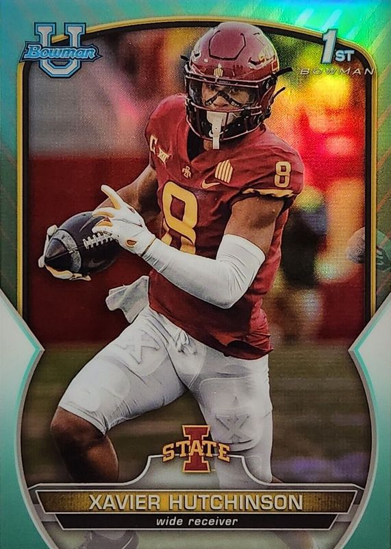 Xavier Hutchinson's Football cards are available in at least 3 sets. Xavier Hutchinson's biggest 7-day price movers are 2022 Bowman Chrome University #32 Prospects - Aqua Refractor /299 (1st), 2022 Bowman Chrome University #32 Prospects - Purple Refractor /399 (1st), and 2022 Bowman Chrome University #32 Prospects - Red Refractor /5 (1st).