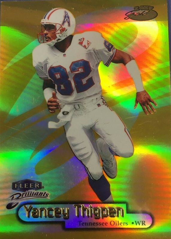 Yancey Thigpen's Football cards are available in at least 30 sets. Yancey Thigpen's biggest 7-day price movers are 1998 Fleer Brilliants #98TG 24-Karat Gold /24, 1997 Metal Universe #19 Precious Metal Gems Green /15, and 1998 Fleer Brilliants #98TG Gold /99.