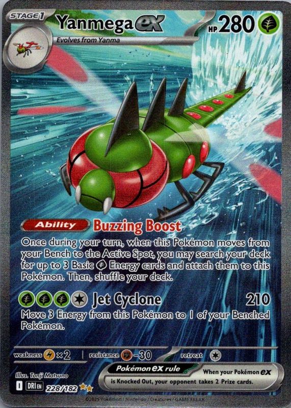 The biggest 30-day change Yanmega ex cards are 2025 Japanese Mega: Mega Dream ex #003/193 Double Rare, 2025 Scarlet & Violet: Destined Rivals #003/182 Double Rare, and 2025 Japanese Scarlet & Violet: Heat Wave Arena #076/063 Super Rare (Full Art).