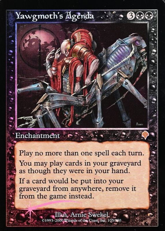 Yawgmoth's Agenda's Magic: The Gathering cards are available in at least 1 sets. Yawgmoth's Agenda's biggest 7-day price movers are 2000 Invasion #135 Foil.