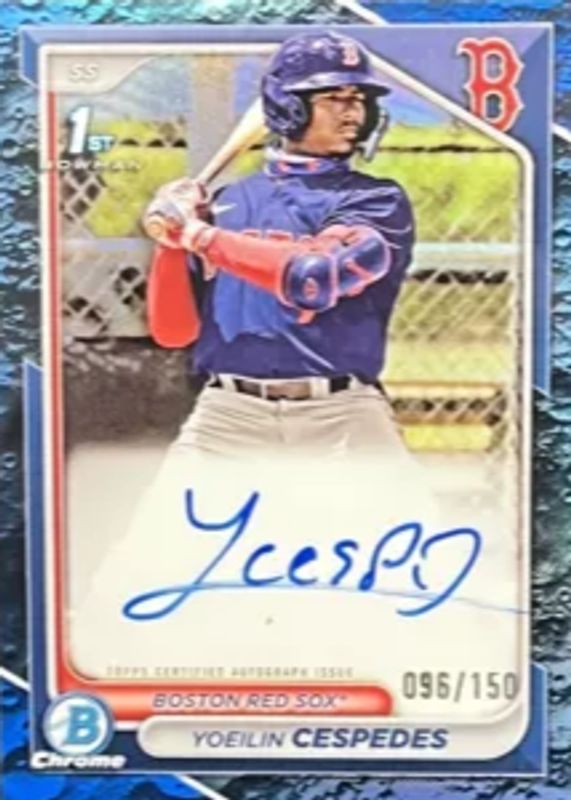 Yoeilin Cespedes' Baseball cards are available in at least 5 sets. Yoeilin Cespedes' biggest 7-day price movers are 2024 Bowman #CPA-YCE Chrome Prospect Auto - Blue Lunar Crater Refractor /150 (1st), 2024 Bowman #CPA-YCE Chrome Prospect Auto - Green Shimmer Refractor /99 (1st), and 2024 Wild Card Five Card Draw #5CDCL-YCA Classic Auto Blue Foil - Blue /2.