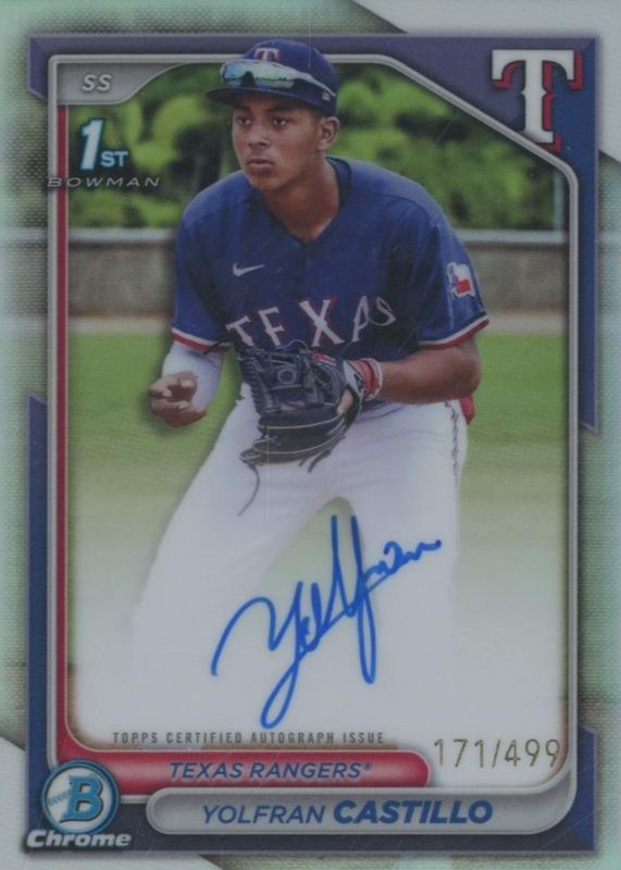 Yolfran Castillo's Baseball cards are available in at least 8 sets. Yolfran Castillo's biggest 7-day price movers are 2024 Bowman Chrome #CPA-YC Prospect Auto - Refractor /499 (1st), 2024 Bowman Chrome #CPA-YC Prospect Auto - Purple Refractor /250 (1st), and 2025 Bowman's Best #B25-YC Best of 2025 Autographs.