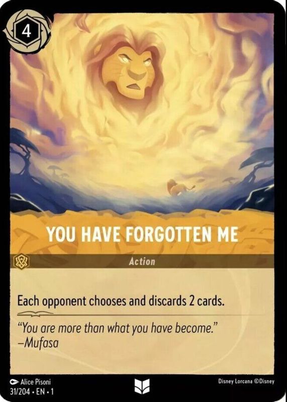 You Have Forgotten Me's Disney Lorcana cards are available in at least 1 sets. You Have Forgotten Me's biggest 7-day price movers are 2023 The First Chapter #31/204 Cold Foil, and 2023 The First Chapter #31/204 Base.